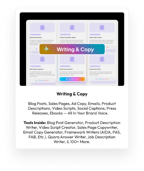 Publish-Ready Content in Seconds – Every output is tailored to YOUR business, YOUR voice, YOUR audience. Not generic AI slop — real, brand-matched content that converts.