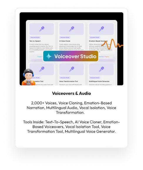 - Clever AI Voiceover Studio – Clone voices, create lifelike narrations in 2,000+ styles, and add human-like emotions to ads, podcasts & audiobooks.