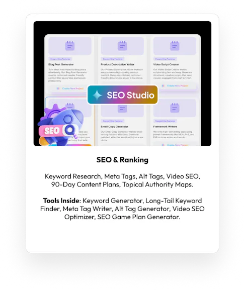 - Clever AI SEO Studio – Optimize blogs, websites, YouTube videos & social content with keyword research, meta tags, and ranking strategies.