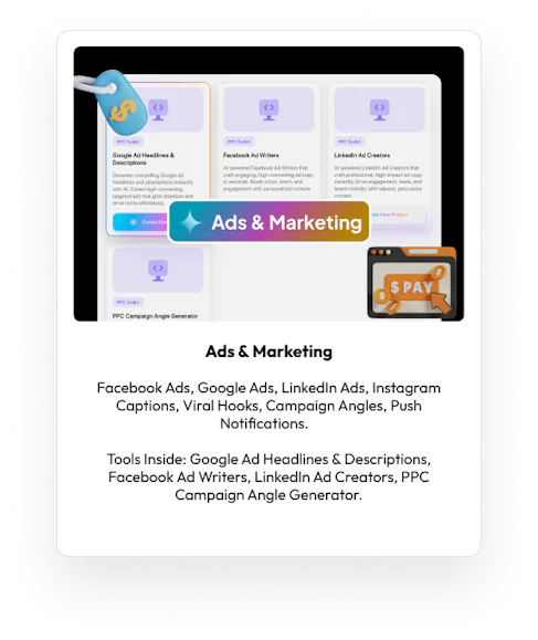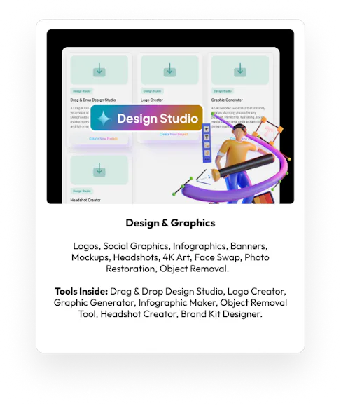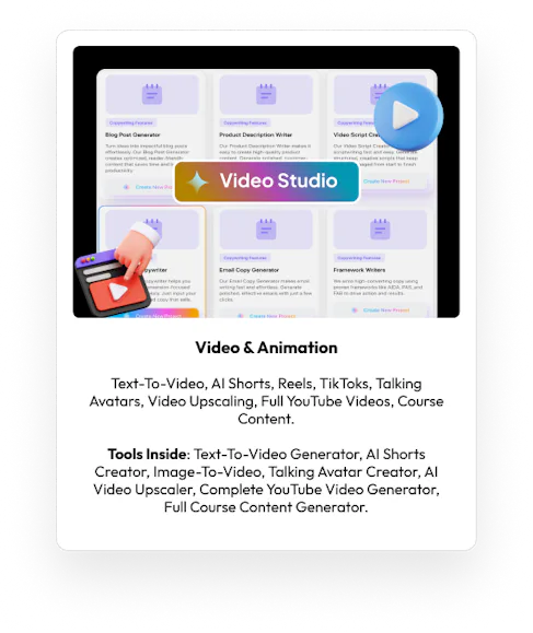 Choose From 300+ Powerful Al Tools - Blogs, Ads, Videos, Voiceovers, Graphics, Social Posts, Automation Flows & More.
