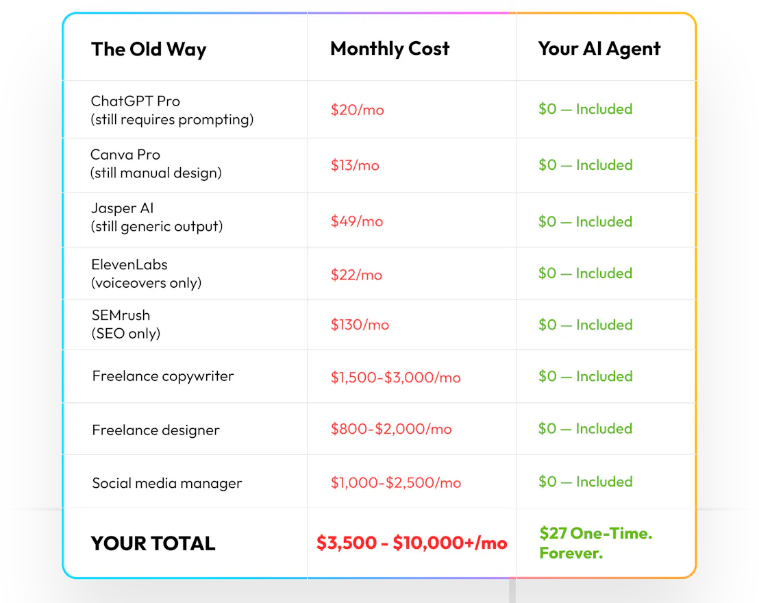 That’s $42,000–$120,000/year in tools and freelancers — replaced by one AI Agent for