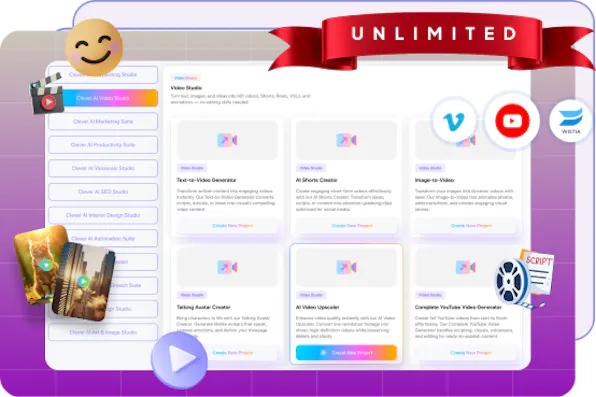 - Unlimited Clever Ai Studio Video Studio — Produce Endless Explainer Videos, Promos, Reels, Shorts, Talking Avatars, And Product Demos — Without Caps Or Limits.