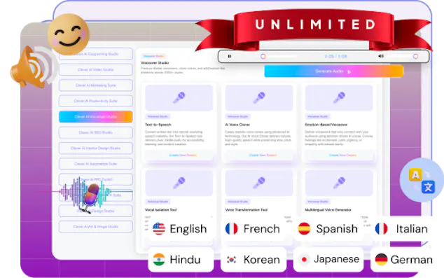 - Unlimited Clever Ai Studio Voiceover Studio — Clone Voices, Generate Emotional Voiceovers, And Produce Podcasts, Ads, And Audiobooks In Unlimited Variations And Styles.