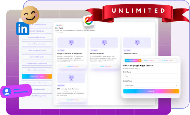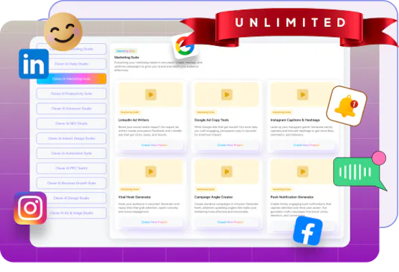 - Unlimited Clever Ai Studio Marketing Studio — Generate Unlimited Ad Campaigns, Cta Creators, Social Hooks, And Promo Creatives — So You Can Market Endlessly.