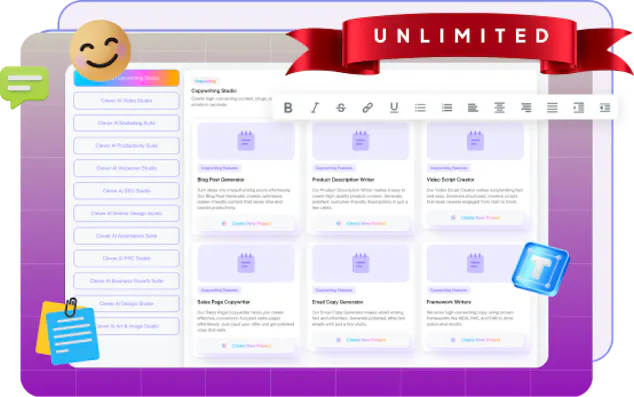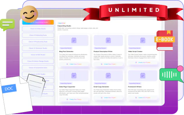- Unlimited Clever Ai Studio Copywriting Studio — Write Unlimited Blogs, Seo Posts, Ad Copy, Emails, Sales Pages, Vsls, And More — Instantly, Without Restrictions.