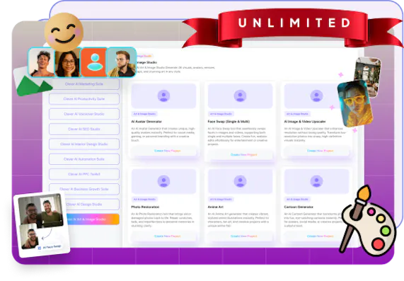 - Unlimited Clever Ai Studio Art & Image Studio — Generate Scroll-stopping 4k Images, Avatars, Product Visuals, Photo Restorations, And Face Swaps — Without Ever Running Out Of Credits.